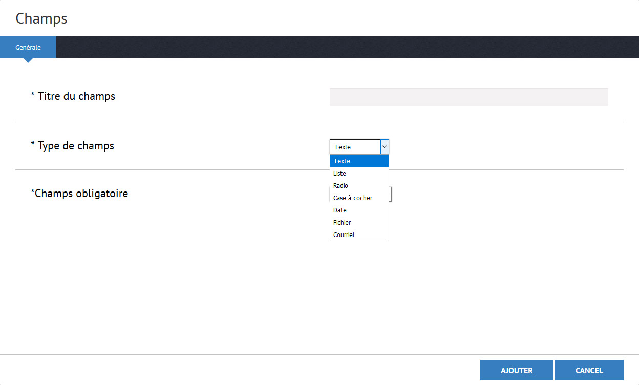 Créer votre formulaire et ajouter vos type de champs que vous avez besoin.